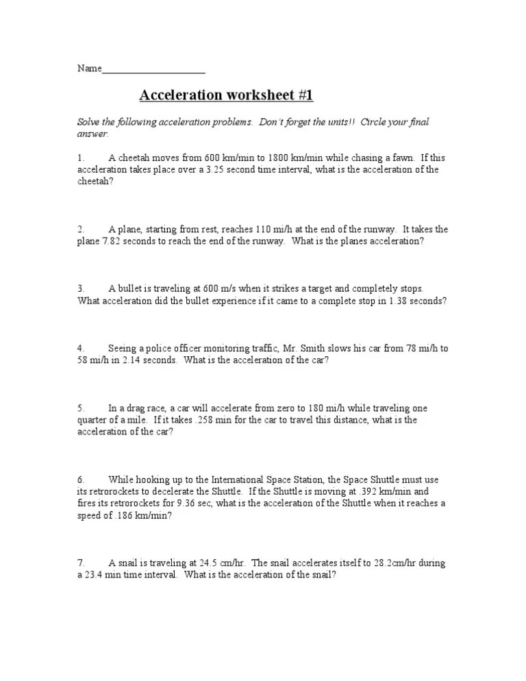 Acceleration Practice Worksheet - Dimanregional Org -. If you're behind a web filter, please make sure that the domains *.kastatic.org and *.kasandbox.org are unblocked. Express her speed in miles/hr. The acceleration of the object is in the same direction as the velocity change vector; Fill each grid space with an appropriately concise answer. Assuming he does not speed up or slow down, what is his speed in meters per second?